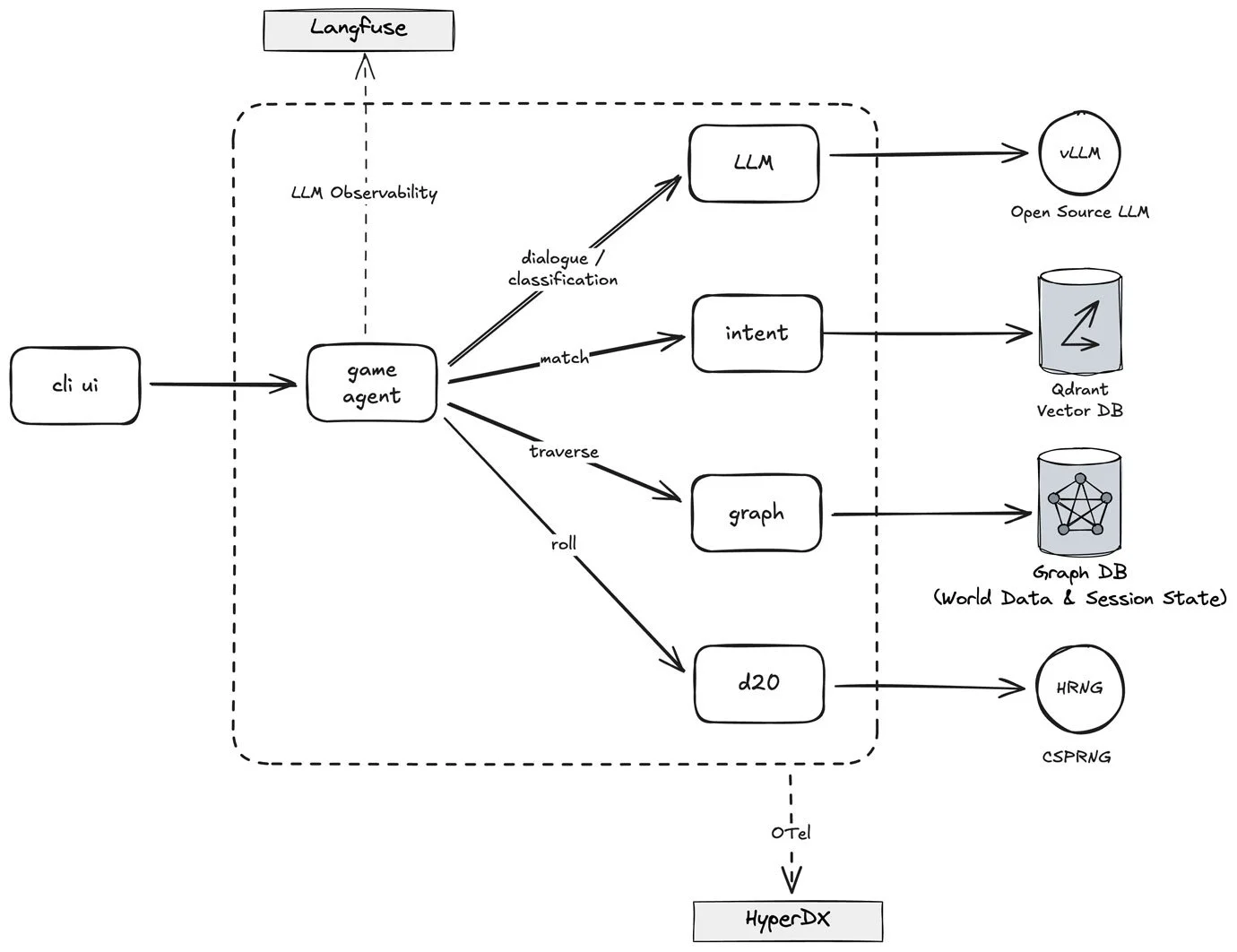 The architecture follows a modular microservices pattern where a central Game Agent orchestrates the flow between specialized services for intent recognition, graph-based state management, and narrative generation. By decoupling deterministic game logic (Graph and D20 services) from probabilistic generative processes (LLM service), the system maintains a rigid "Source of Truth" while providing fluid, immersive storytelling. This entire pipeline is wrapped in a production-ready observability layer using Langfuse for agentic tracing and HyperDX for system-wide telemetry.