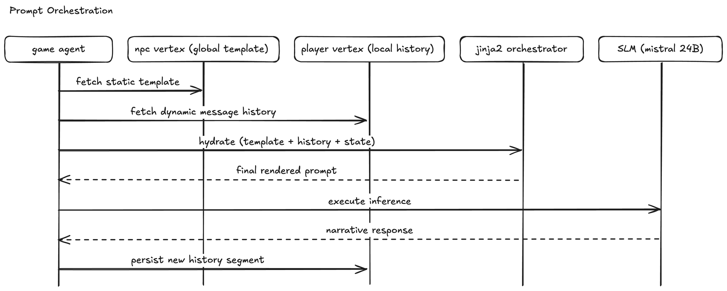- Distributed State Model: Conversation templates are stored on the NPC vertex and are shared across all players, ensuring narrative consistency. Conversely, the individual conversation history-including the specific prompts and generated SLM responses-is persisted on the Player vertex. This separation allows the world to remain static while player interactions remain unique and persistent.